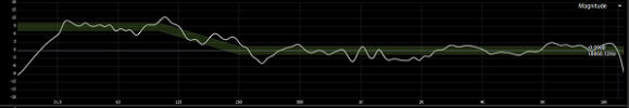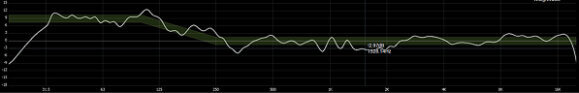 Ten element wypada równie dobrze, widać że odstępstwa od krzywej referencyjnej, oznaczonej na wykresie ciemno zielonym kolorem o szerokości +-1.5 dB są niewielkie. Bardzo dobre dopasowanie fazowe przełożyło się na równie dobry wynik analizy częstotliwościowej. Prezentowany wykres jest uśredniony do 12 ppo. Deklarowany przez producenta początek pasma, tj 30Hz jest jak najbardziej prawdziwy widać to na wykresie poniżej.
