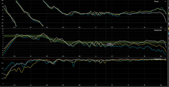 Producent deklaruje propagację poziomą która ma wynosić 90°. Poniżej załączone są 3 nałożone na siebie wykresy. Kolor szary to mikrofon pomiarowy skierowany wprost w paczkę czyli 0°, kolor żółty to 20° odchylenia, a kolor niebieski 40°. Widać, że spadek wysokich częstotliwości jest dość spory, rozpoczyna się przy 1.5 kHz i trwa aż do końca pasma. Nie jest to wynik który dyskwalifikuje ten zestaw, ale w mojej ocenie powinien być na nieco wyższym poziomie.