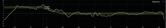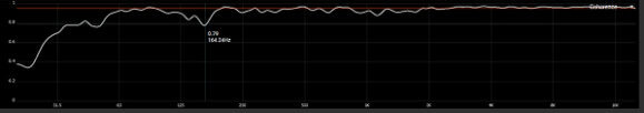 Dalej, aż do częstotliwości 77 Hz, pomiar utrzymuje się w granicach wyznaczonych przez krzywą referencyjną. Przy 77 Hz mamy delikatny “dołek”, a następnie sporą “górkę” przy 108 Hz.