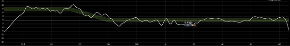 Może to oznaczać, że należałoby spróbować nieco lepiej zgrać ze sobą subbas z satelitą. Niestety przez to, że system jest zamknięty nie mamy możliwości wprowadzenia żadnych korekt ani zmian w miejscu podziału pasma. Analizując wykres dalej widzimy całkiem spory spadek przy częstotliwości 320Hz. Jest to częstotliwość, której bardzo chętnie pozbywamy się przy wokalu natomiast w niektórych gatunkach muzycznych może jej nam zwyczajnie zabraknąć.